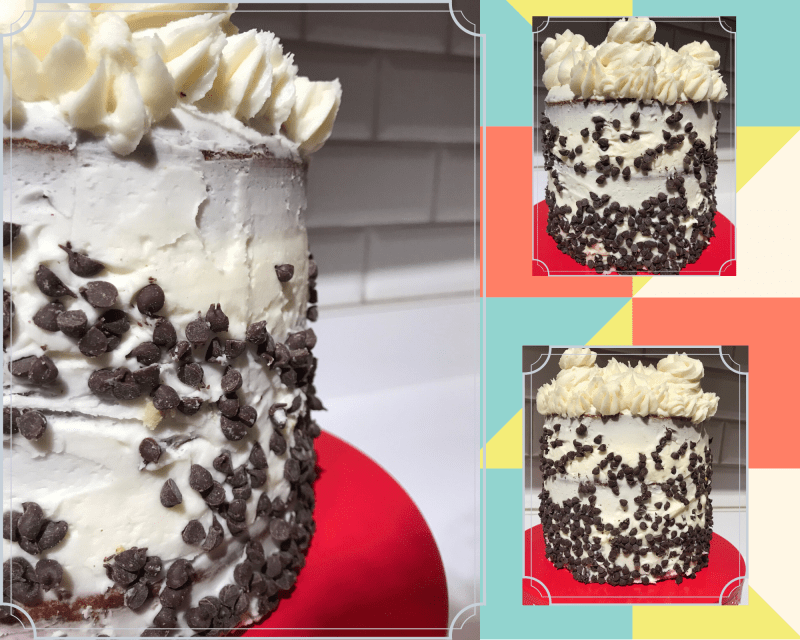 - Use the reaming bag of mini chocolate chips to coat the bottom of the cake, bringing them slightly up the sides.