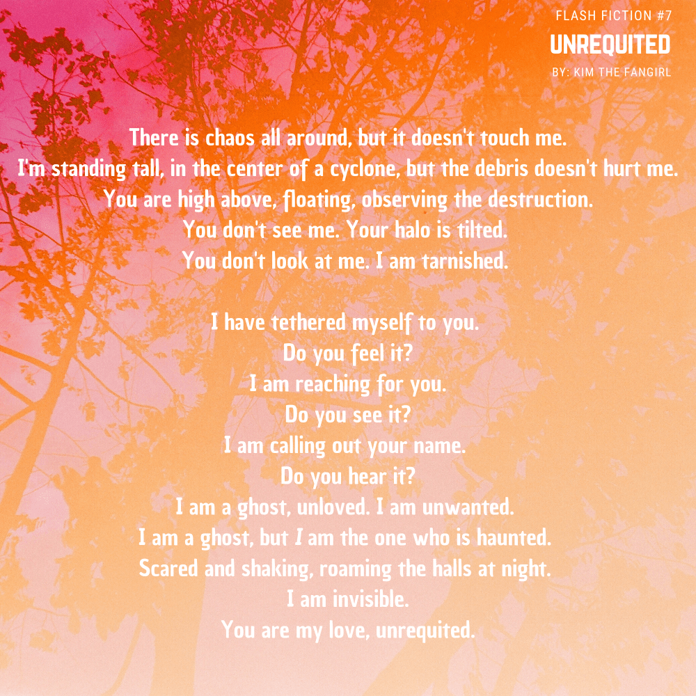 Flash Fiction, The Writer's Room Flash Fiction #7: Unrequited Posted by Kim the FanGirl on March 1, 2020April 2, 2020 HAPPY READING! π See you tomorrow! For more Kim the FanGirl follow the blog on Twitter @kimthefangirl and on Facebook Share this: Click to share on X (Opens in new window) X Click to share on Facebook (Opens in new window) Facebook Click to share on Tumblr (Opens in new window) Tumblr Click to share on Pinterest (Opens in new window) Pinterest Click to email a link to a friend (Opens in new window) Email Click to print (Opens in new window) Print Like Loading... Related